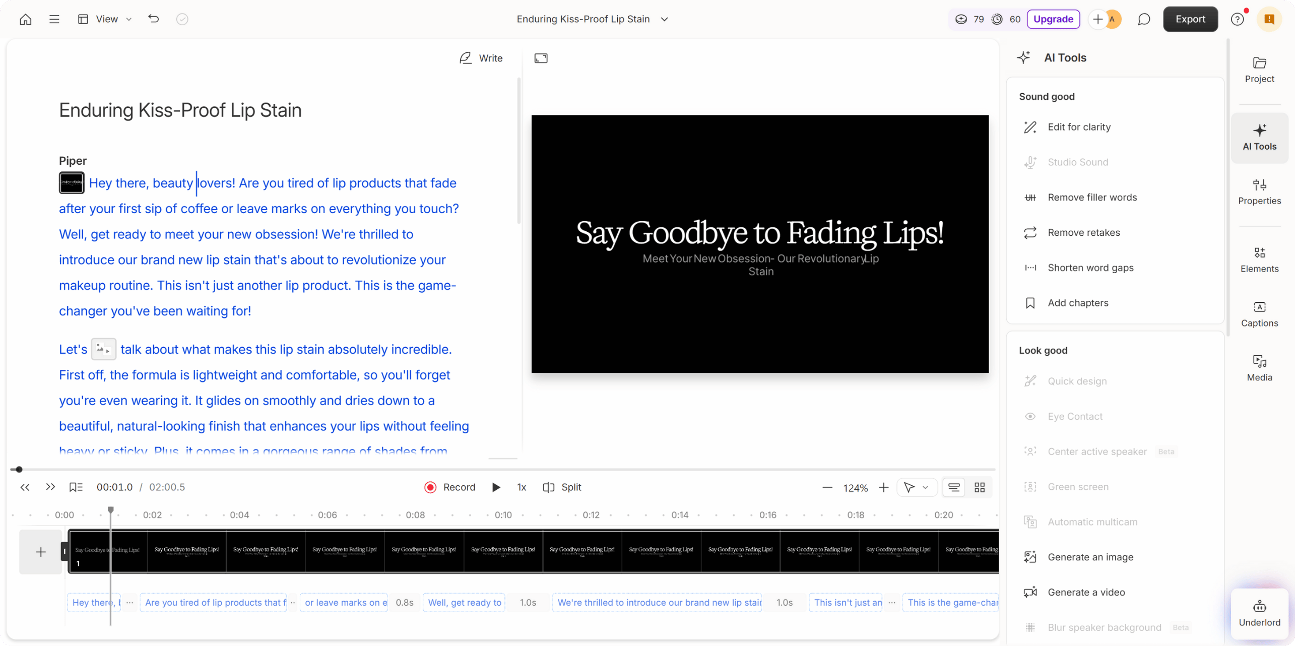 • Delete or replace words in text, and the video updates automatically
