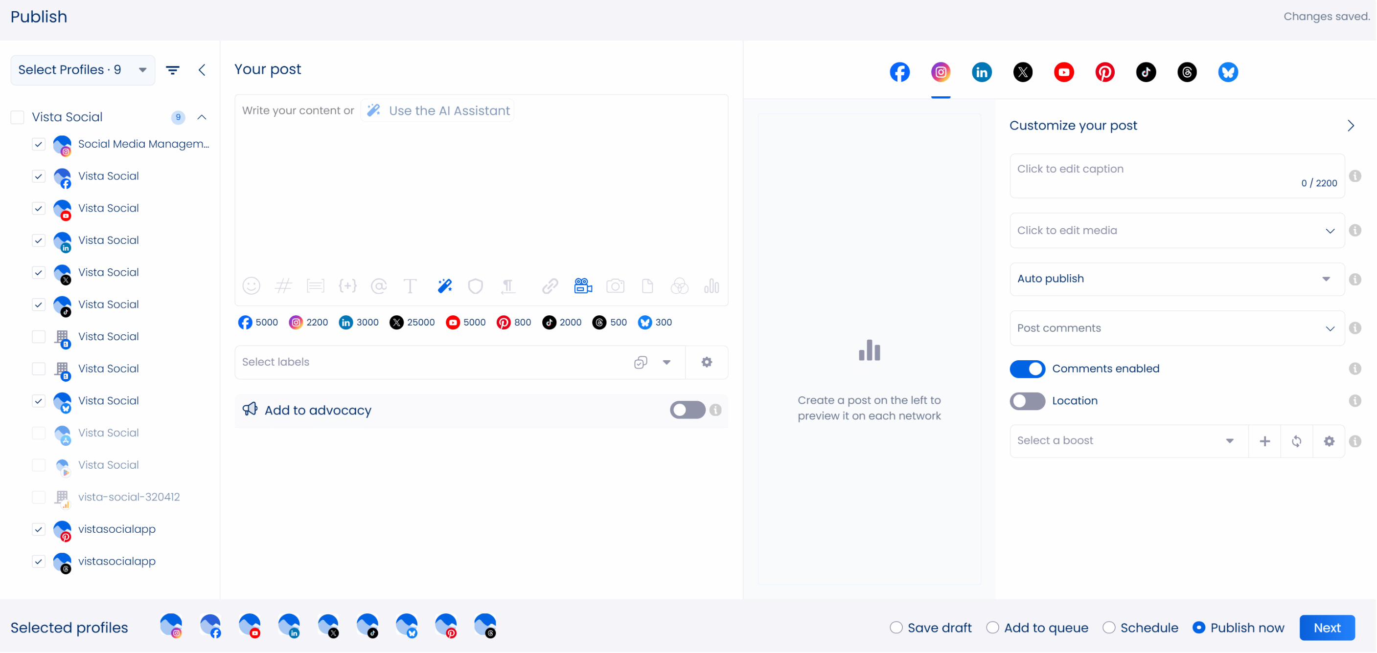 Click Save when you’re done. You can use the AI Assistant to generate engaging captions for your post instantly. Vista Social will automatically insert your caption to the post.