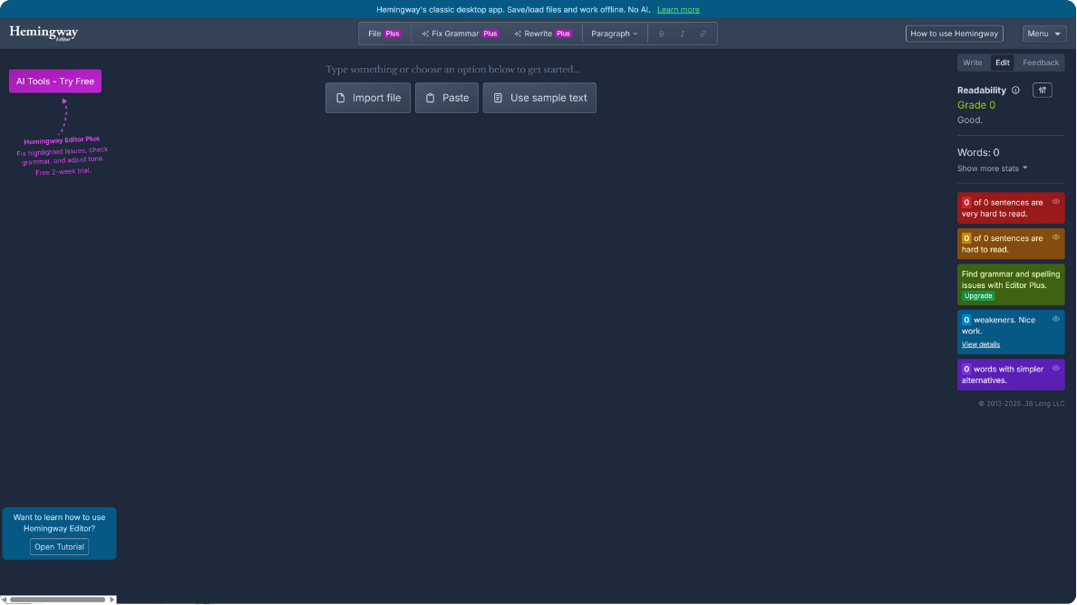 Pricing: Free web version available; desktop app costs $19.99 one-time; Hemingway Editor Plus plans start at $25/month