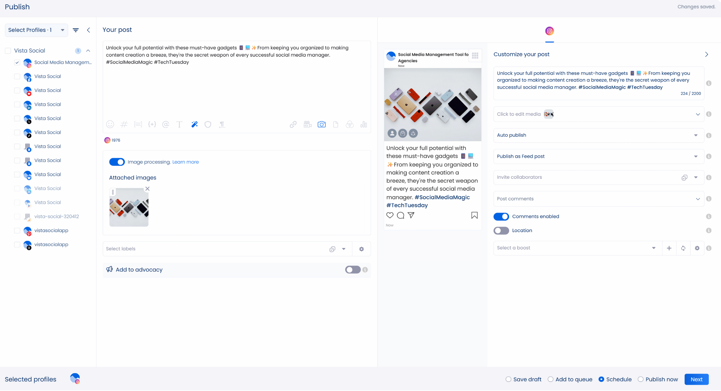 Social media management platforms like Vista Social let you schedule posts automatically and include data-backed suggestions for optimal posting times to maximize engagement.