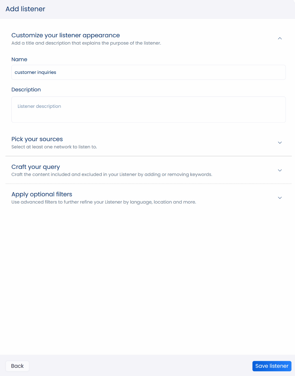 The best part is that creating a listener is simple. Just give it a name, add a description explaining its purpose, select your sources and keywords, and you’re all set.