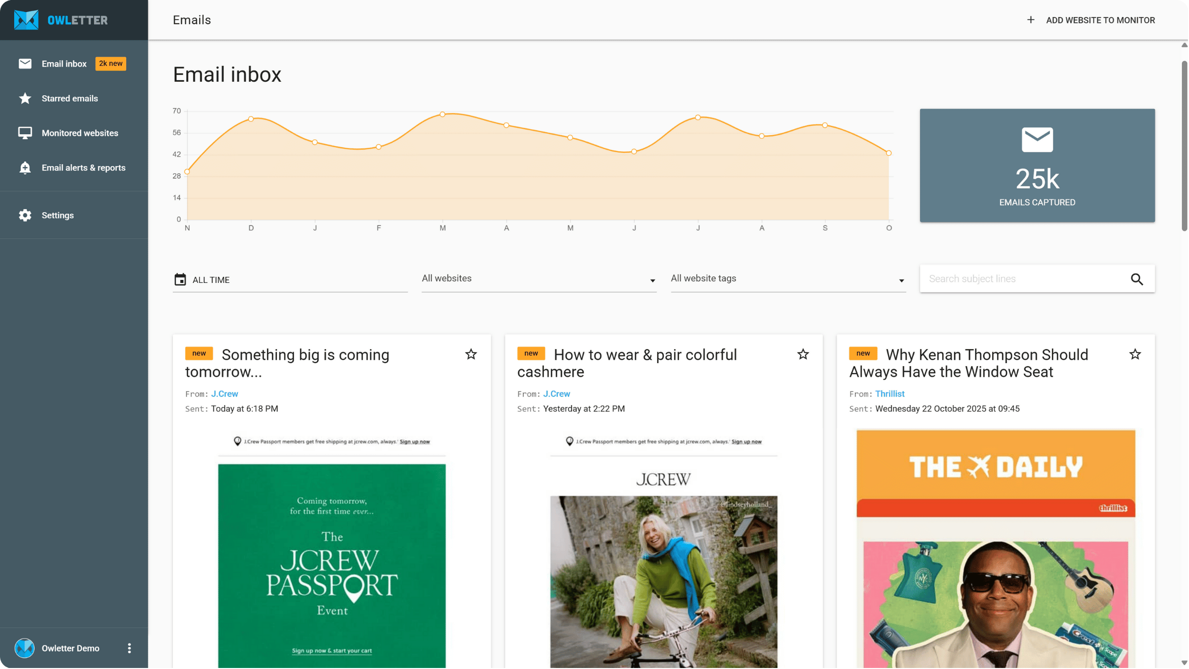 Picture this: instead of digging through endless promo emails trying to figure out what your competitors are doing, Owletter does it for you. It collects the emails brands send to their lists, keeps them organized, and turns all that inbox activity into clear email analytics you can use.