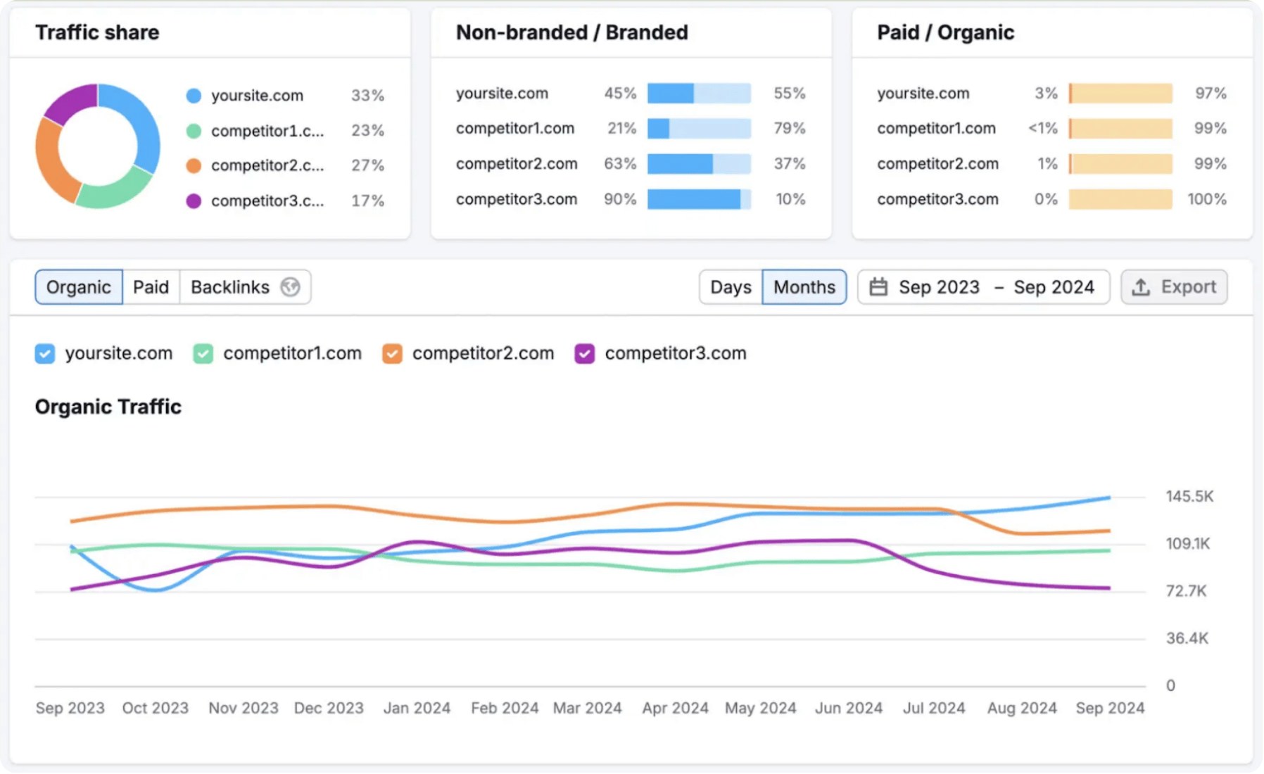 You can enter any competitor’s domain to see their top keywords, estimated organic traffic, high-performing pages, backlink sources, and how their rankings compare with yours. The platform also includes keyword and backlink gap tools that reveal areas where you can improve or expand your strategy.