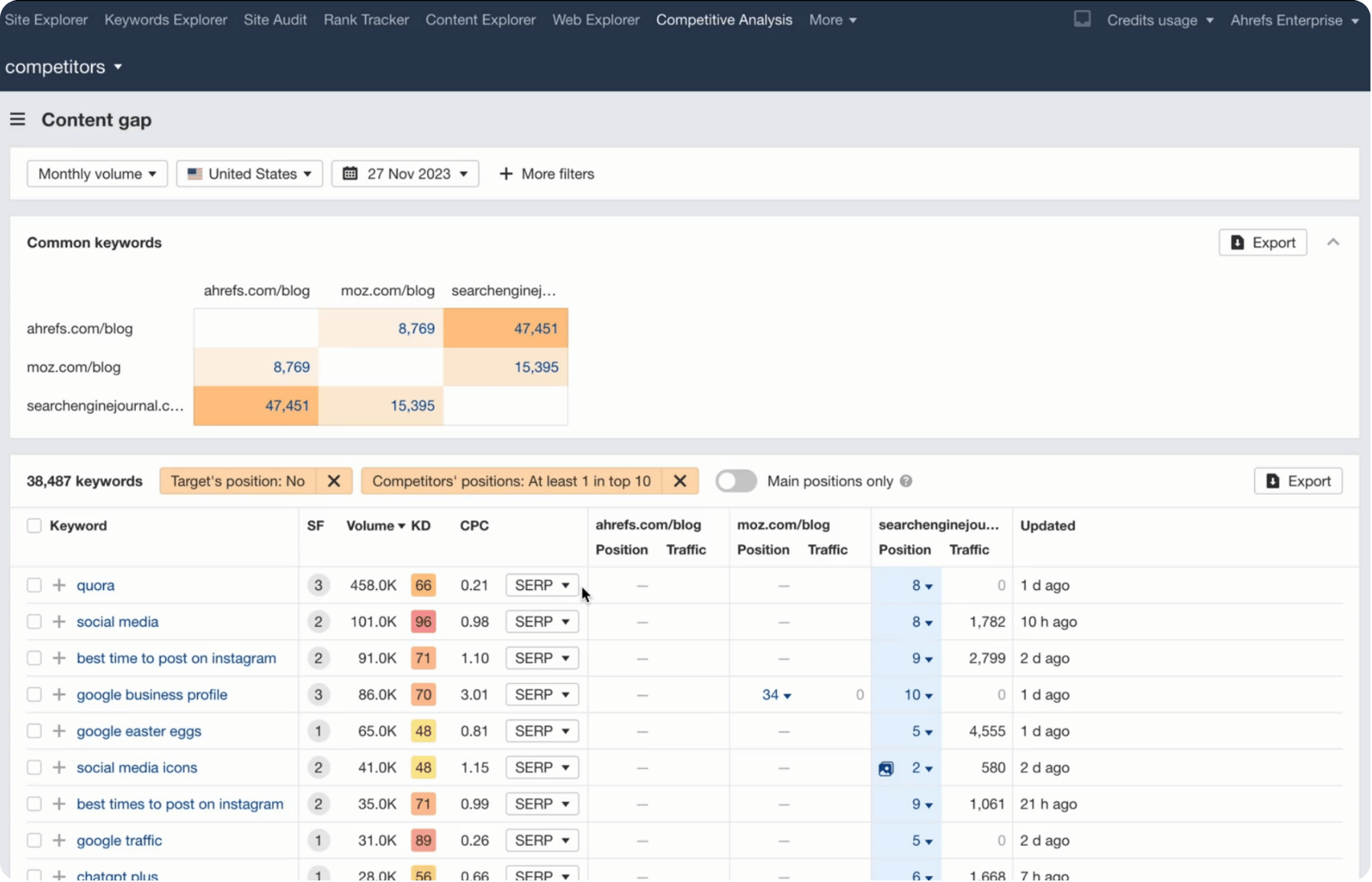 The platform lets you inspect your competitors’ link profiles and identify which pages drive the most traffic. You can also use its Content Gap feature to uncover keywords your competitors target but you haven’t yet optimized for.
