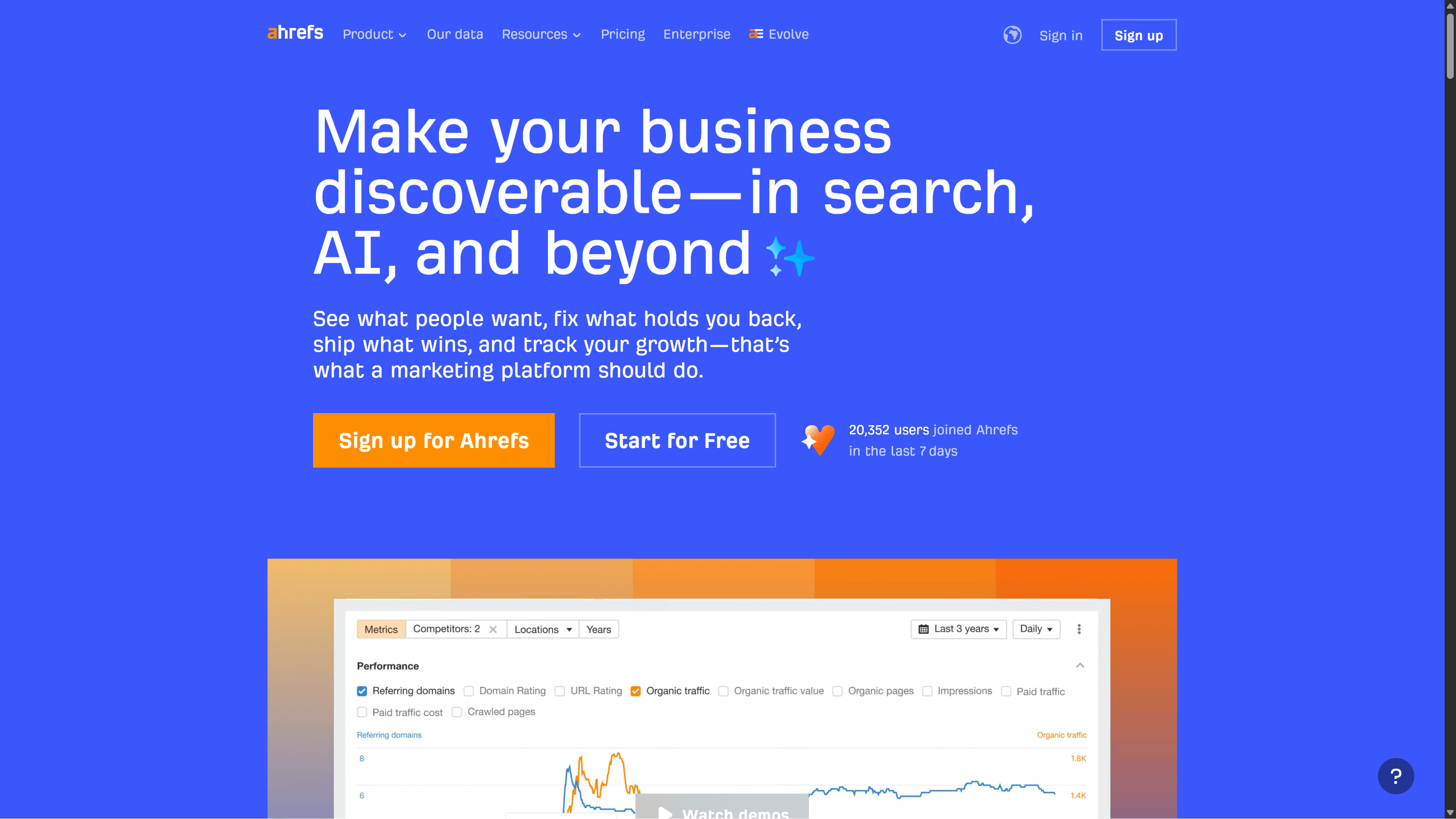 Ahrefs maintains the largest backlink database in the industry, making it the go-to tool for link building and competitor research. You can analyze any website’s complete backlink profile, find new link opportunities, and track your rankings across search engines.