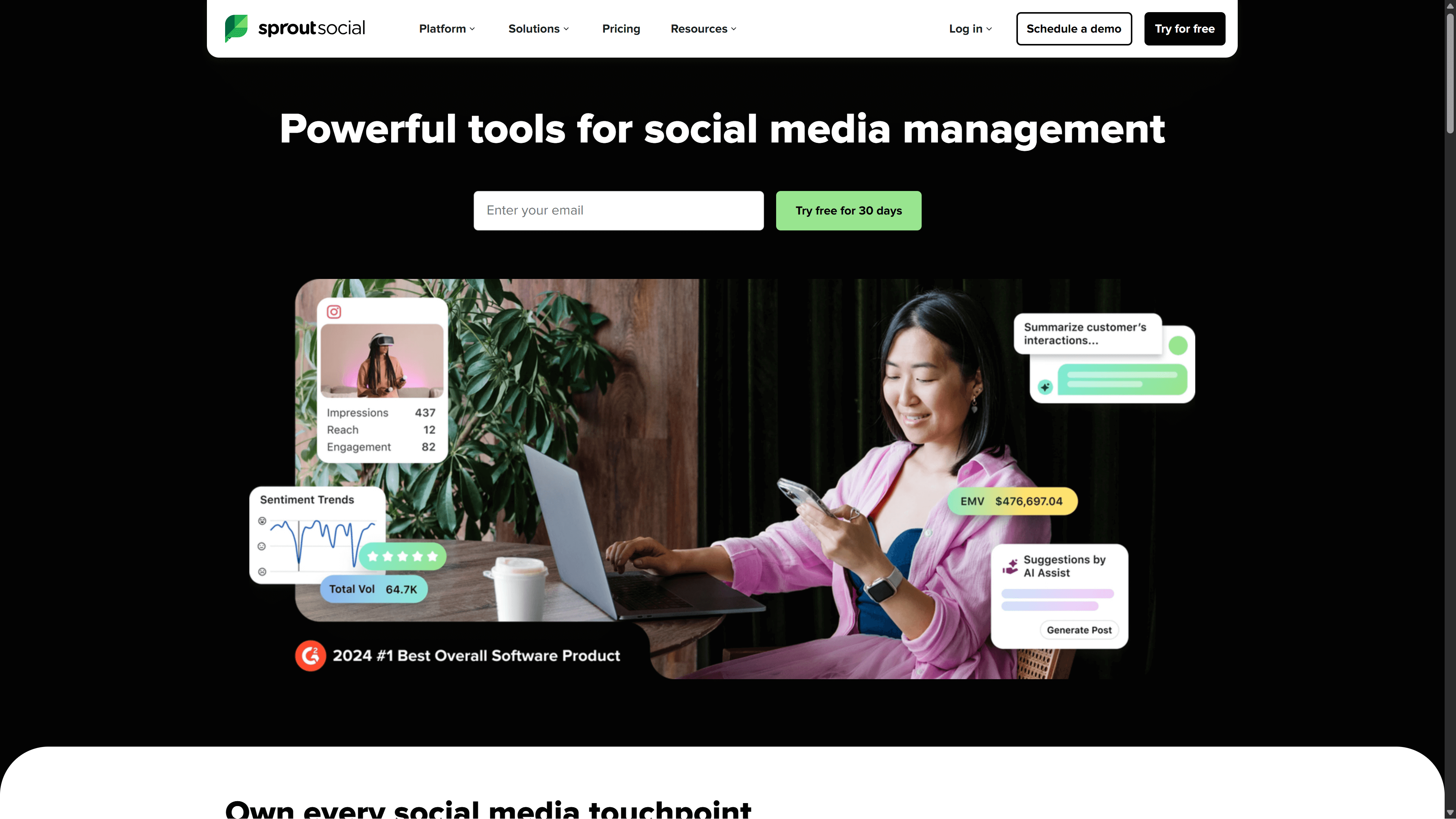 Sprout Social is built for large organizations that need comprehensive analytics across multiple teams and departments. The platform excels at creating custom reports that show exactly how social media contributes to business goals, with features like competitive benchmarking and sentiment analysis.