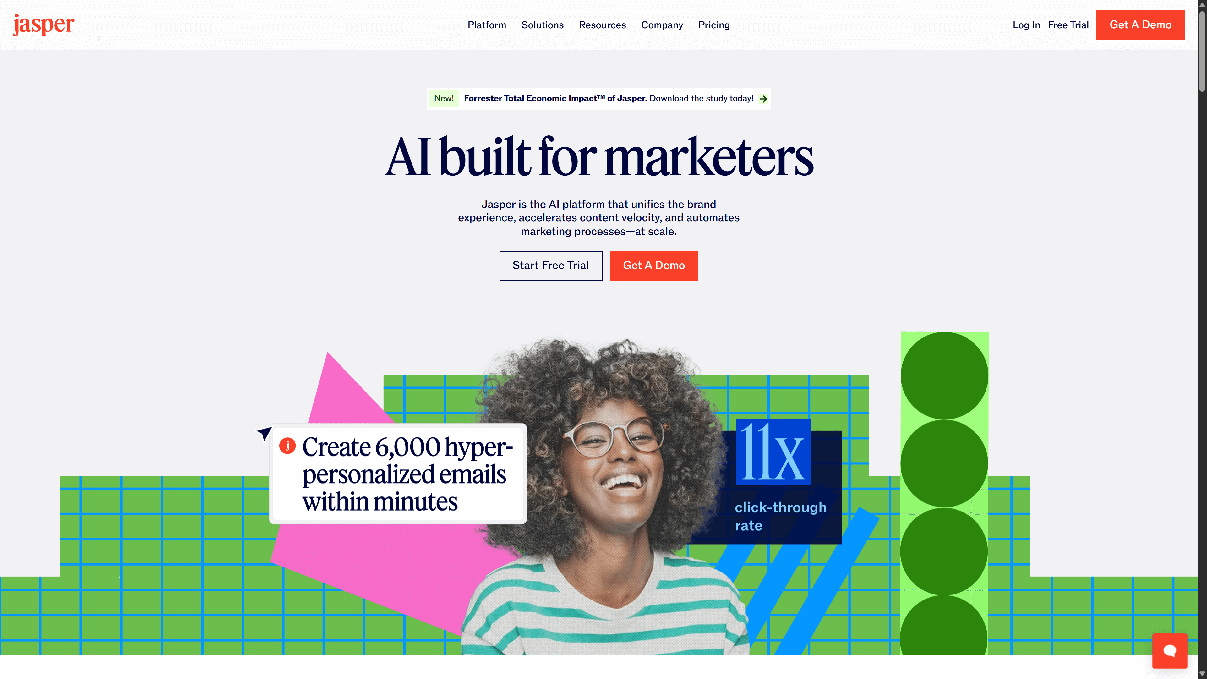 Jasper learns your brand voice and generates content that matches your style and tone. The platform offers templates for specific content types like Facebook ads, Google ads, email campaigns, and blog posts.