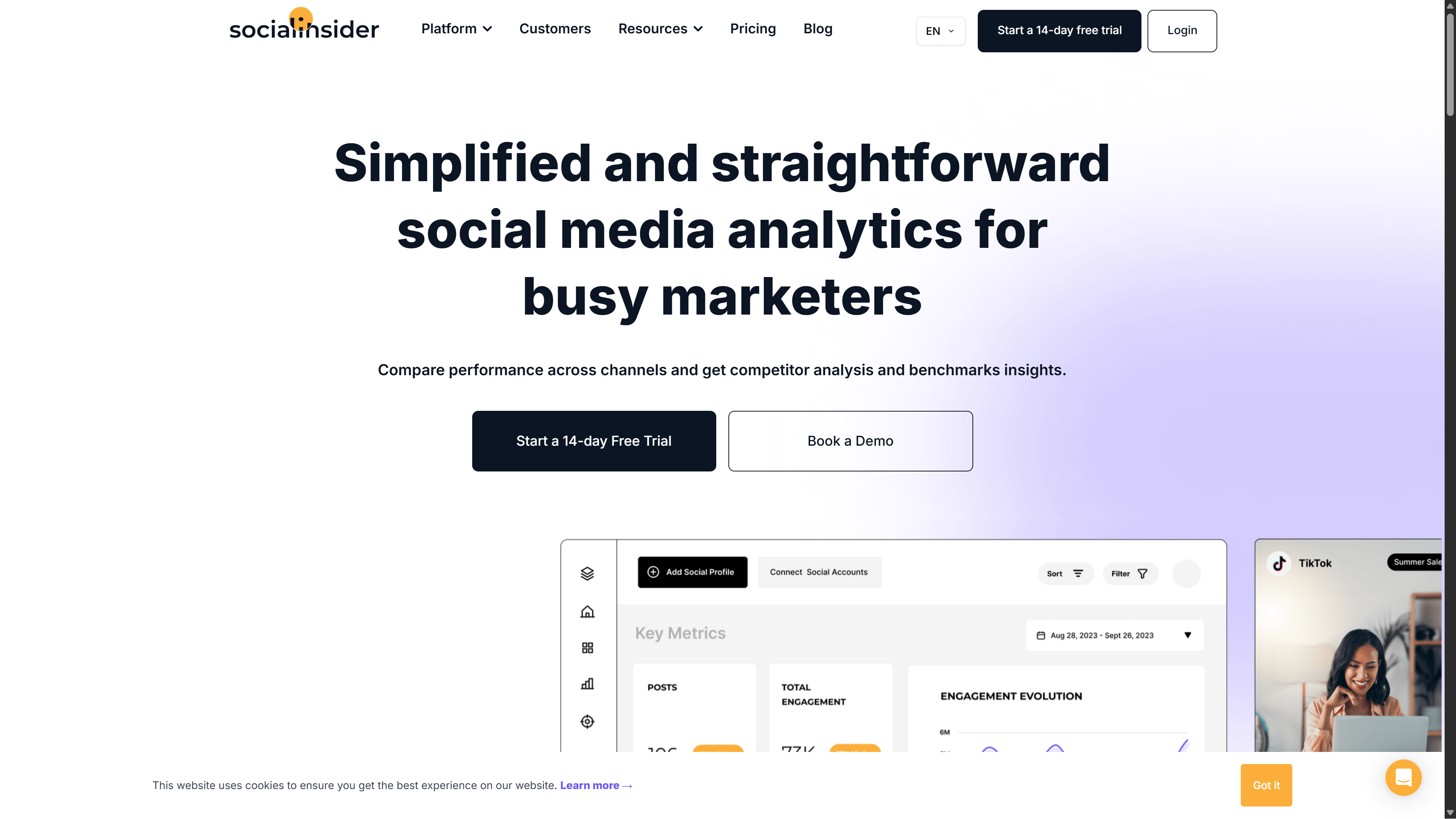 Socialinsider specializes in helping you understand how your social media performance stacks up against competitors. The platform pulls competitor data and creates benchmark reports that show where you’re winning and where you’re falling behind.