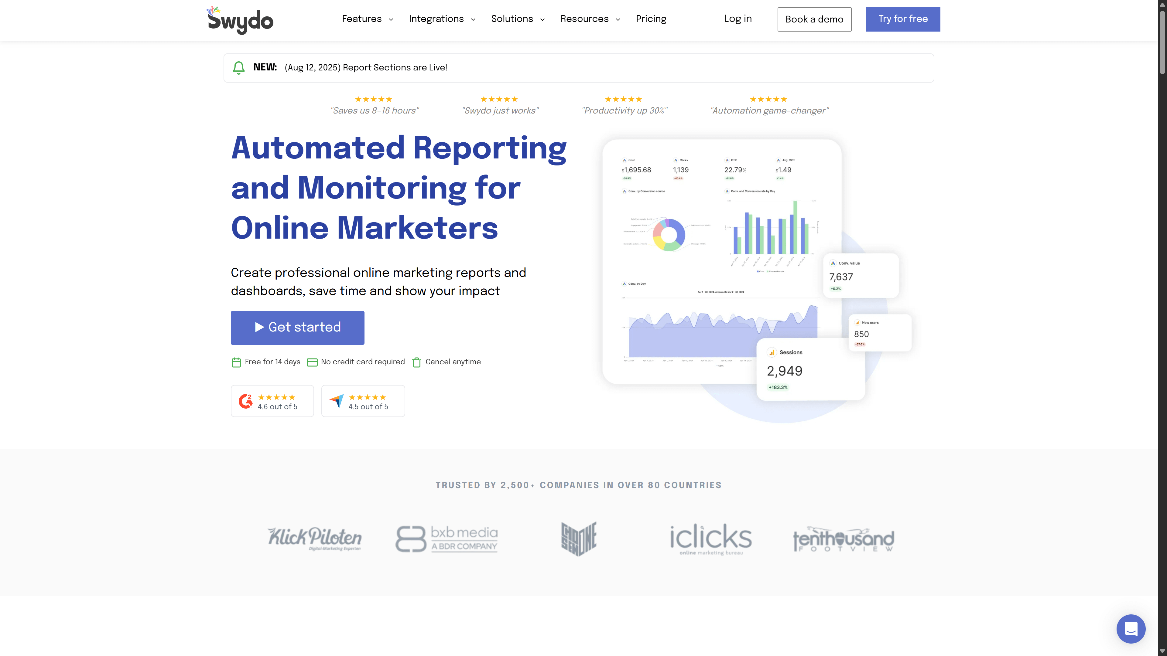 Swydo focuses specifically on automating the tedious work of creating marketing reports for clients. You connect your data sources once, set up your report templates, and the platform automatically generates updated reports on your schedule.