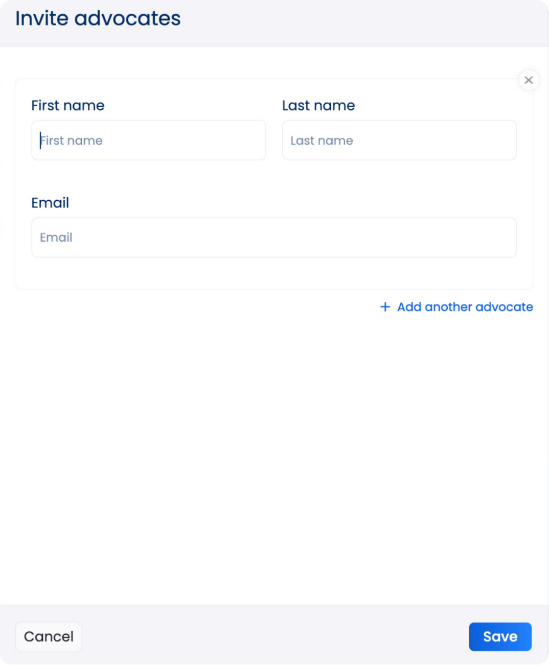 Next, invite your advocates by uploading a CSV file of their names and email addresses. You can also input the information manually.