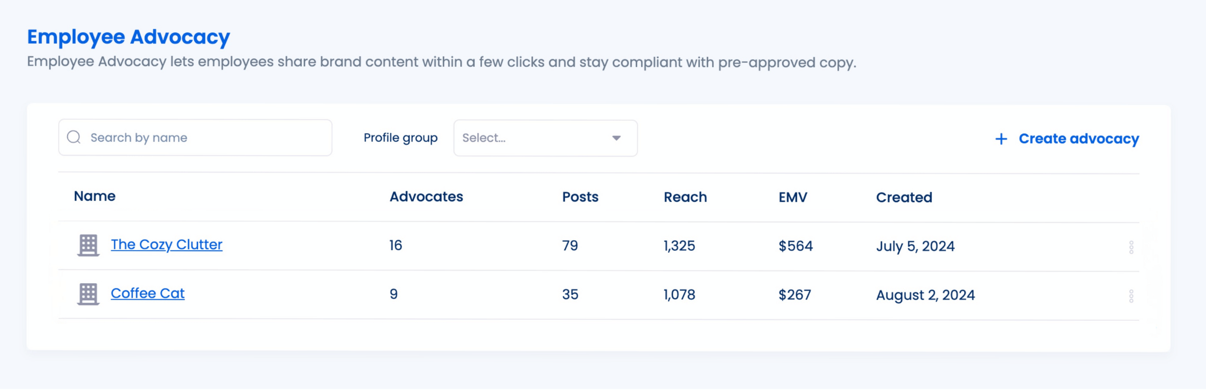 You’ll see details and tools for your advocacy program on the platform’s Advocacy dashboard.
