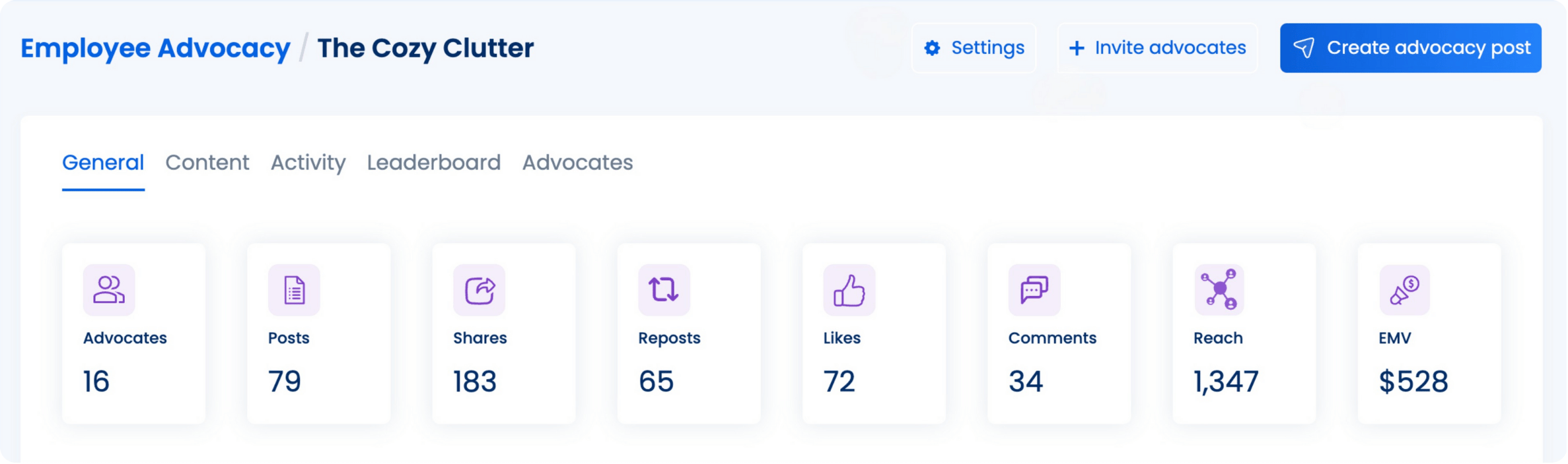 You can also view performance insights instantly as your team engages. The dashboard highlights who your most active advocates are and what content drives the most reactions. Tracking becomes even more powerful when you tailor analytics to match your goals.