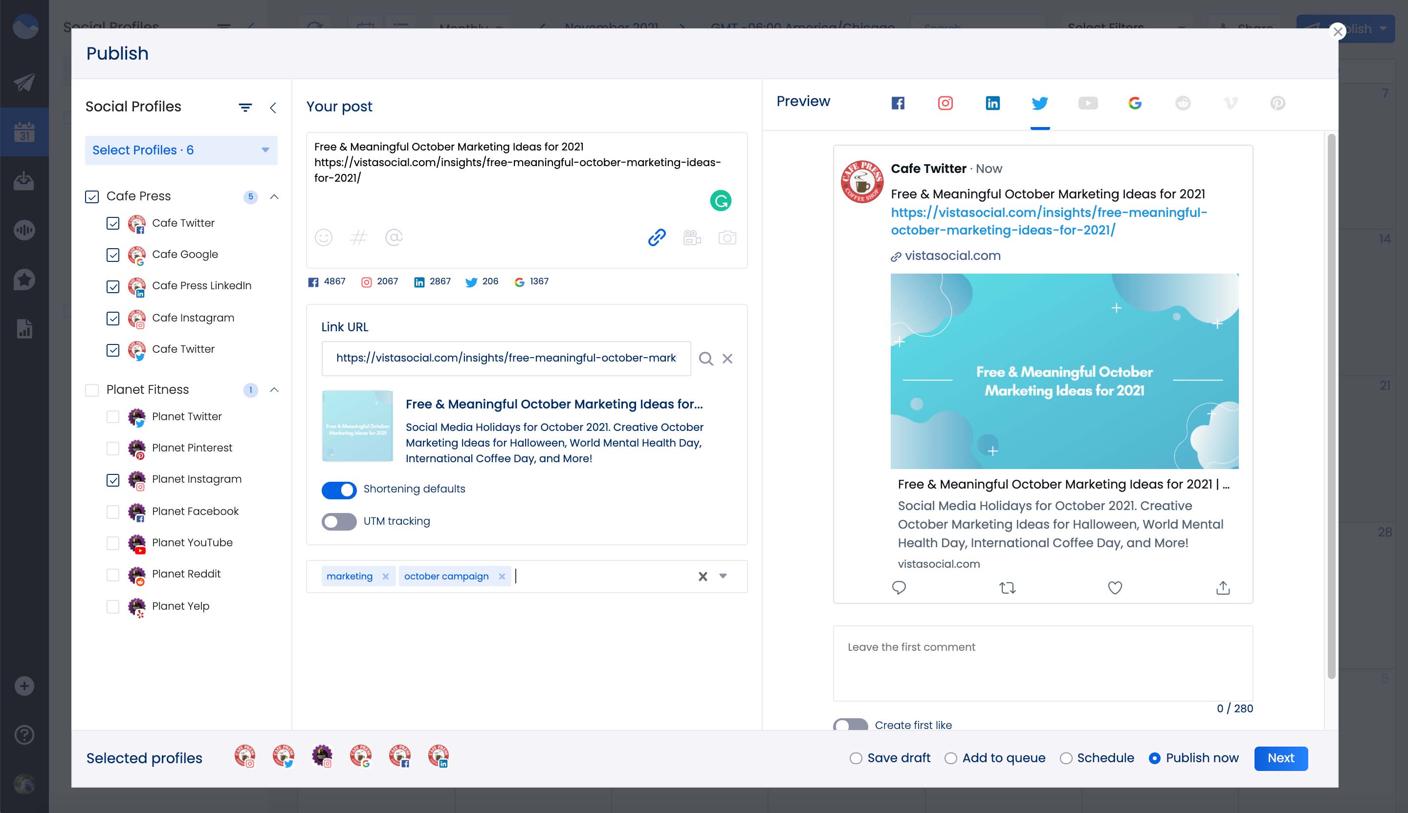 Vista Social will help you optimize and summarize your work on Twitter. Get a deeper view of how Twitter drives site traffic. Start your free trial to evaluate the tool’s features.