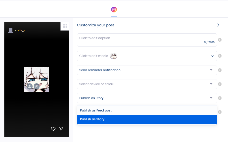 Step 3: Upload your image or video to the post publisher. Note that you can only schedule one Story at a time, so you’ll have to upload each Story you plan to schedule individually.