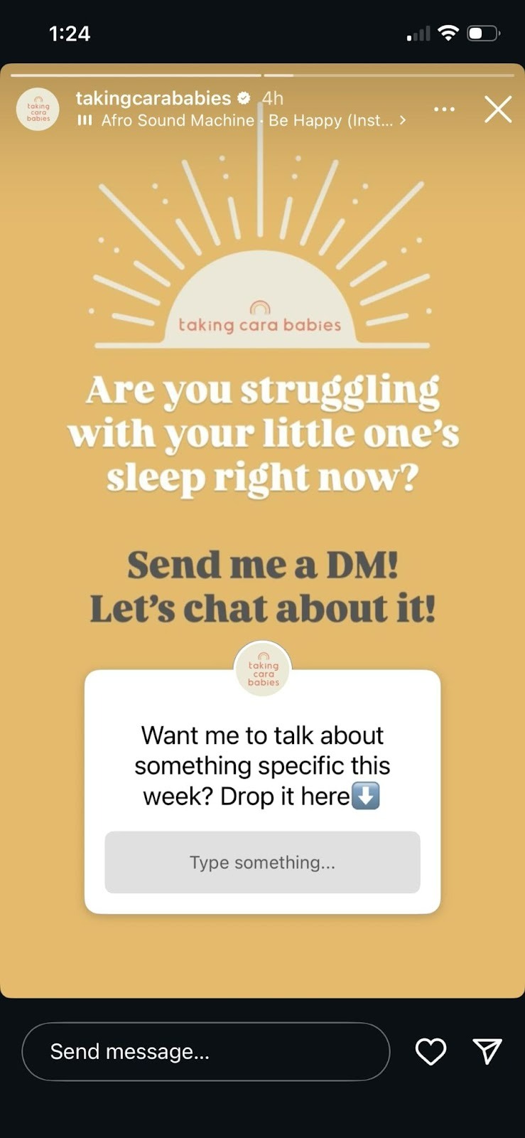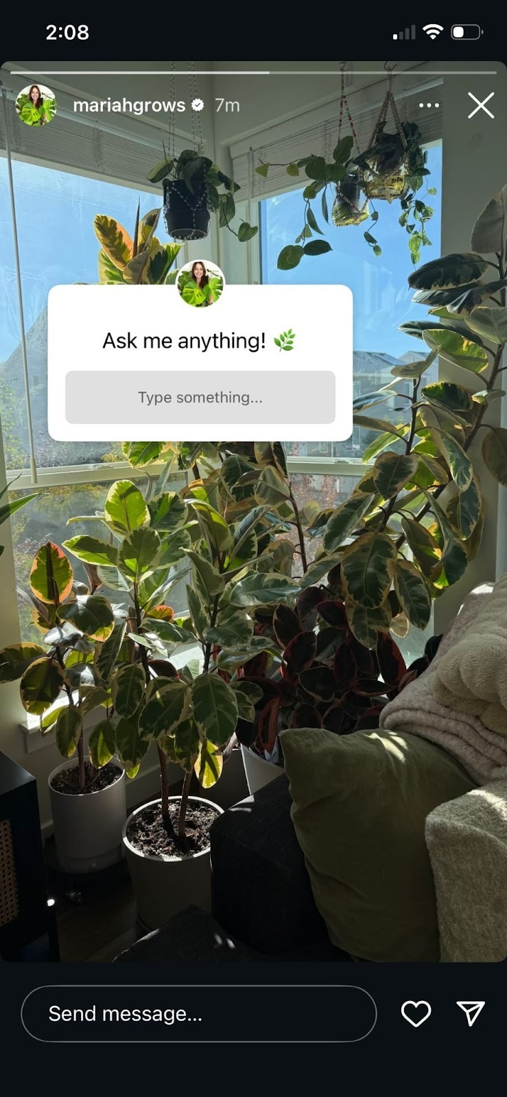 Example: Plant influencer Mariah shared a Q&A sticker with the prompt “Ask me anything!” Her followers can then ask questions related to plant care and other topics that she’ll answer by adding even more Stories.