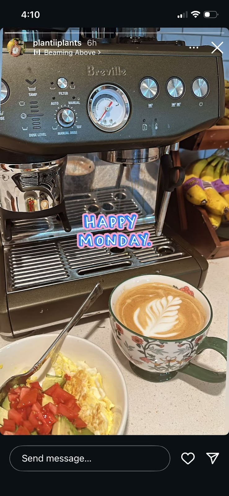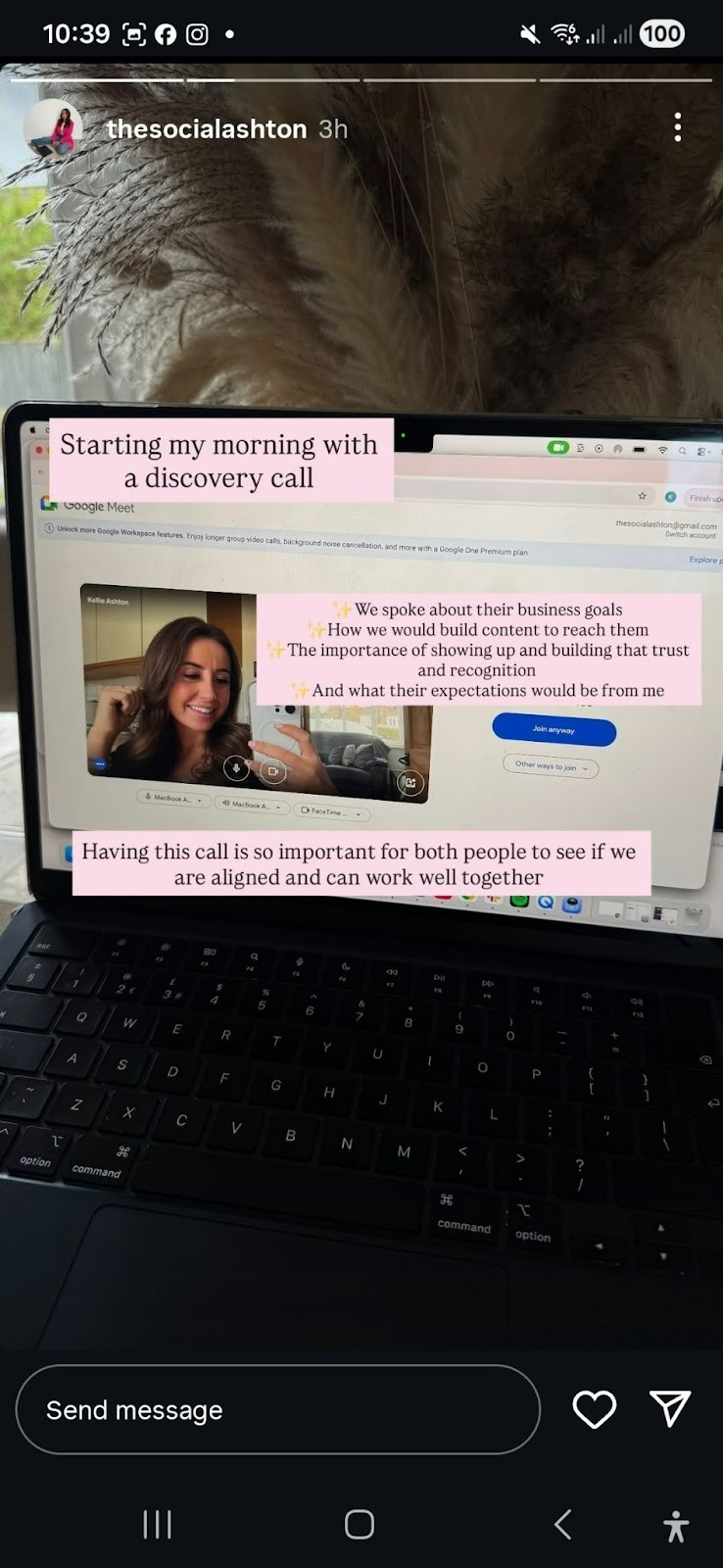 Example: The Social Ashton shares behind-the-scenes moments from her daily work as a social media strategist. In this Story, she shows herself starting her morning with a discovery call, giving followers a peek into her screen during the actual meeting.
