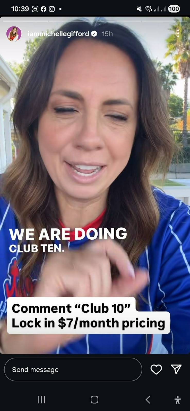 Example: Michelle Gifford uses Stories to offer exclusive deals to her most engaged followers. In this Story, she announces “Club 10,” a special pricing offer where followers can lock in $7/month pricing by commenting “Club 10” on her post.