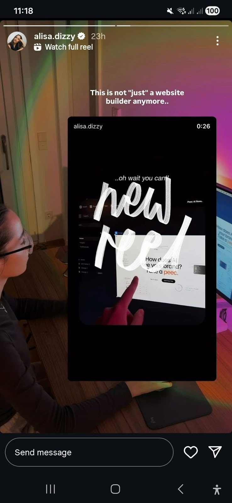 Example: Alisa Dizzy shows followers how Framer actually works by recording her screen while using it. She adds text saying “This is not ‘just’ a website builder anymore,” and includes a “Watch full reel” prompt to drive people to see the complete tutorial.