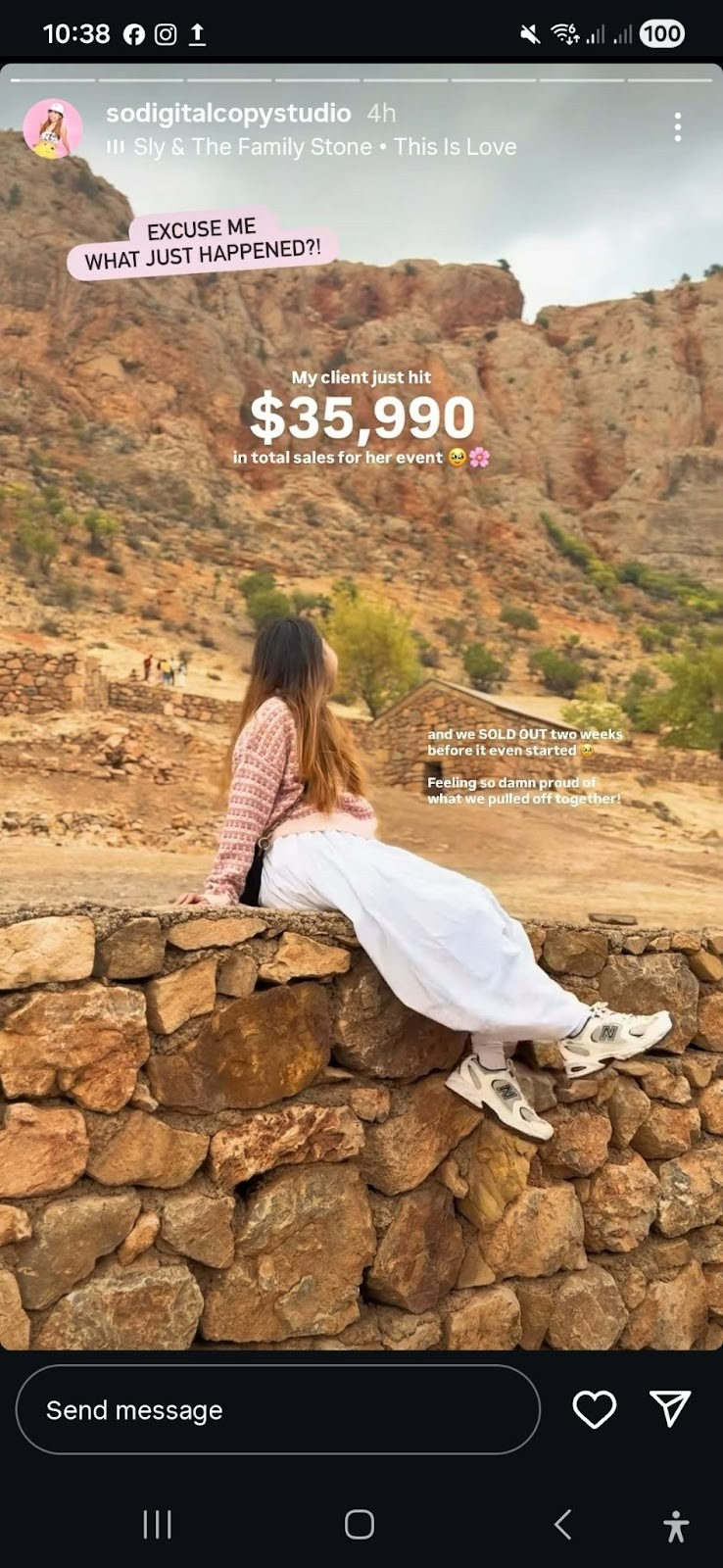 Example: So Digital Copy Studio, run by sales copywriter Sofia from the Philippines, shared a client win in her Stories. Her client sold out their Face Fitness Conference two weeks early and hit $35,990 in sales.