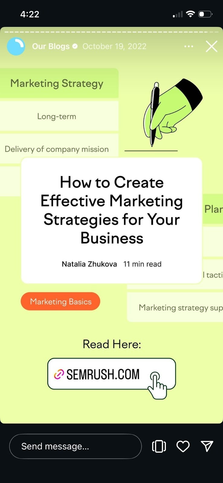 Example: Semrush creates graphics for its recent blog posts and shares them via Instagram Stories, plopping a link in a premade “Read here” section. This can be a great way to incorporate Instagram into your blog content distribution strategy.