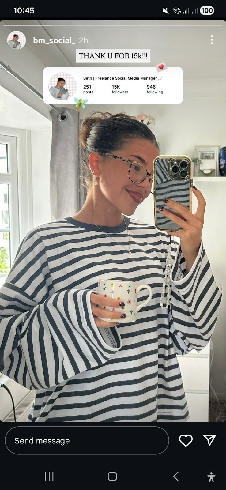 Example: BM Social celebrates hitting 15K followers by sharing a mirror selfie with her follower count displayed prominently. She keeps it simple with “THANK U FOR 15k!!!” and includes her profile stats to show the milestone.