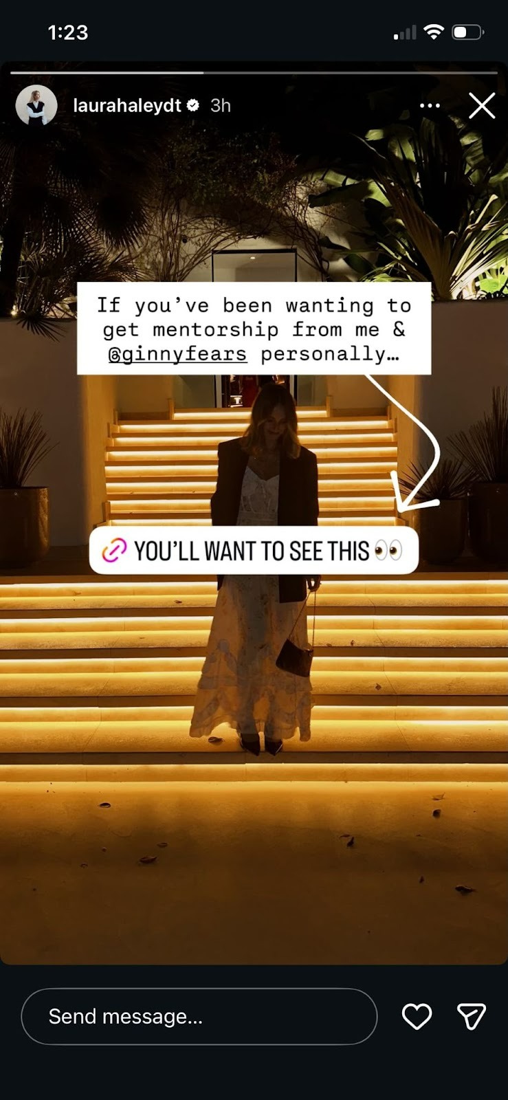 This creates urgency and makes her Story viewers feel like they’re getting insider access to a limited deal. This strategy also works because it rewards her most active followers with special pricing while driving engagement.