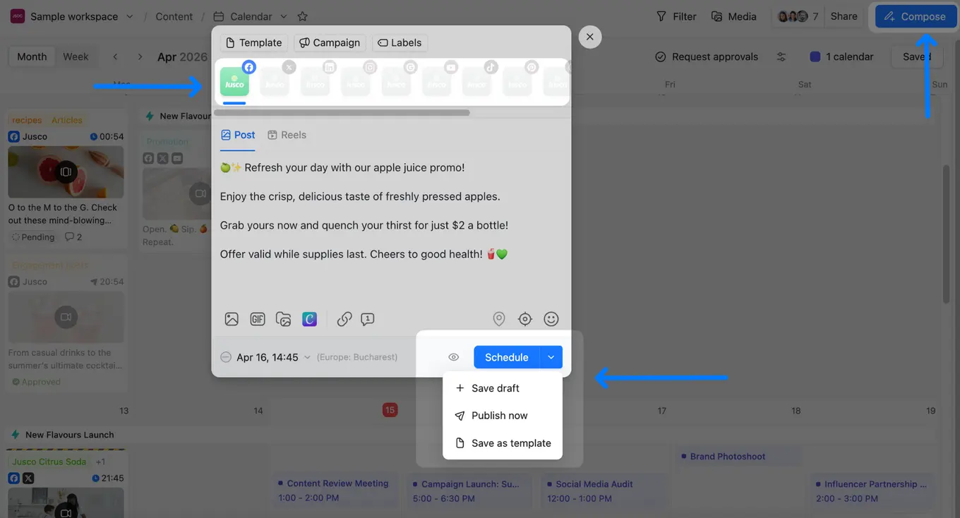 - A unified marketing calendar with four content views (feed, grid, calendar, and list) so you can plan ahead, spot scheduling gaps, and bulk-approve content from the list view