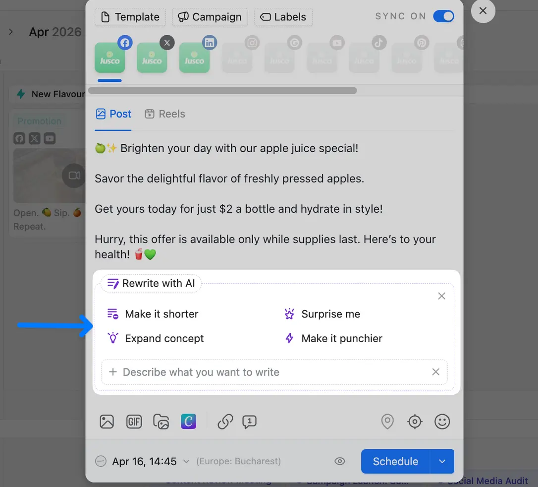 - Auto-generate captions for social media posts with the AI feature. You can always tweak and improve the auto-generated content before scheduling or publishing the posts