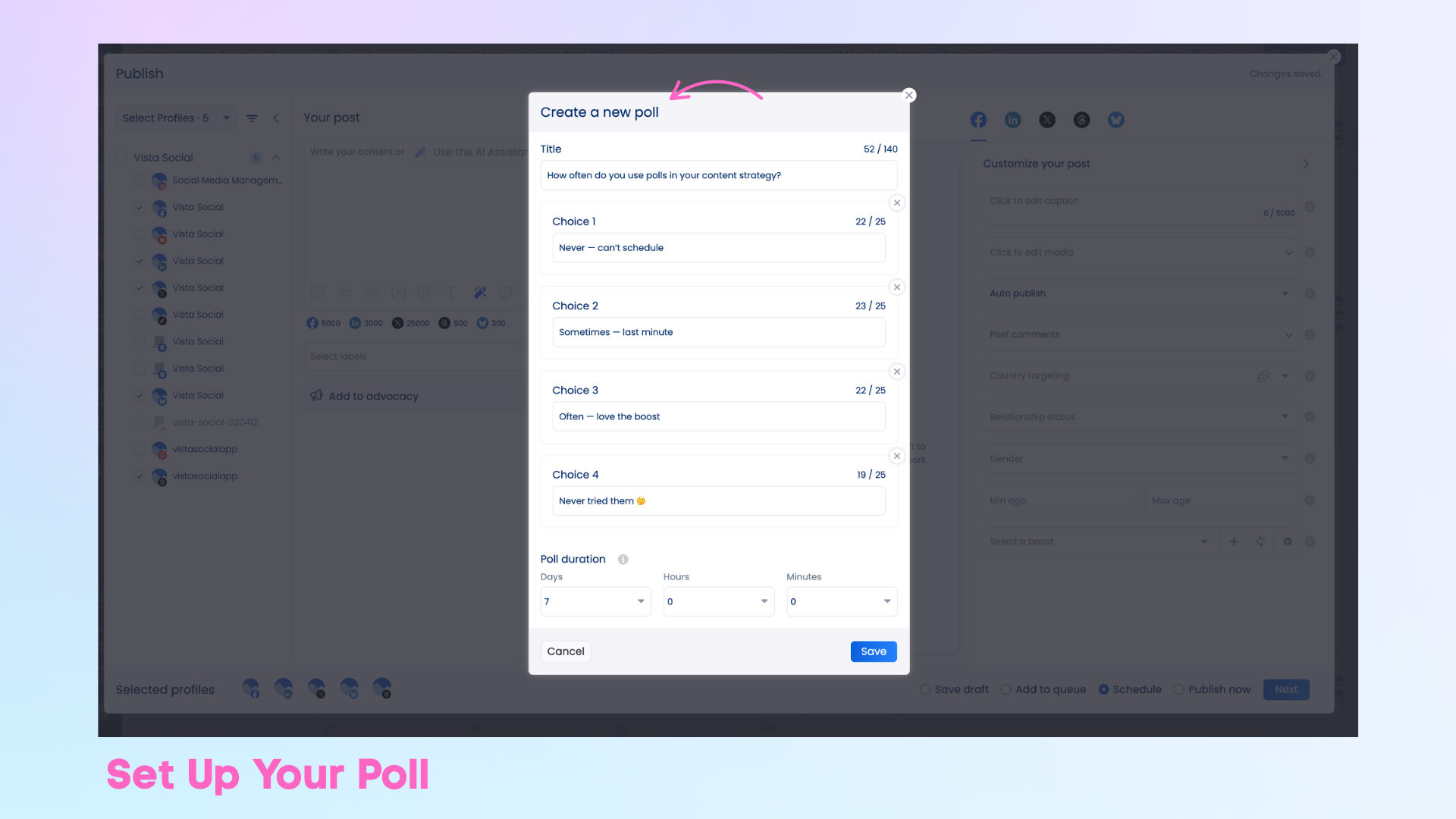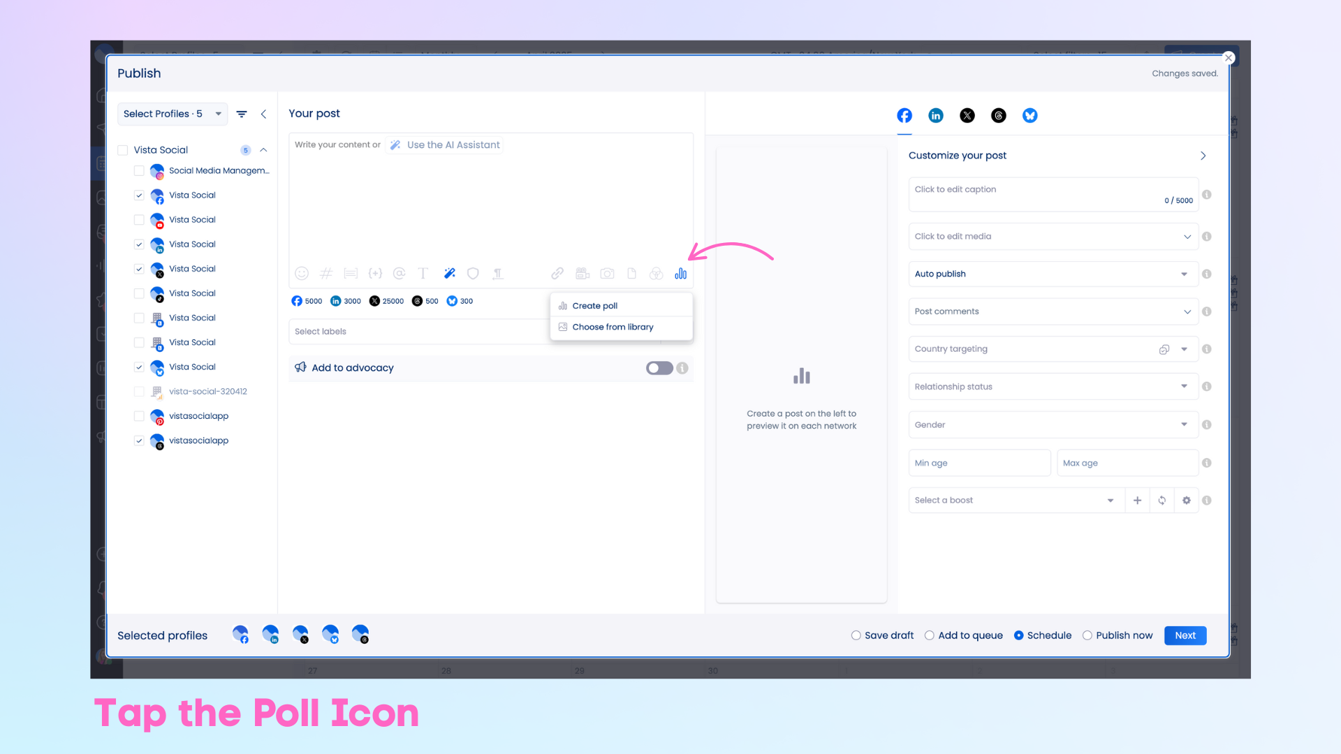 Getting started with polls in Vista Social is fast and intuitive—here’s exactly how to do it: