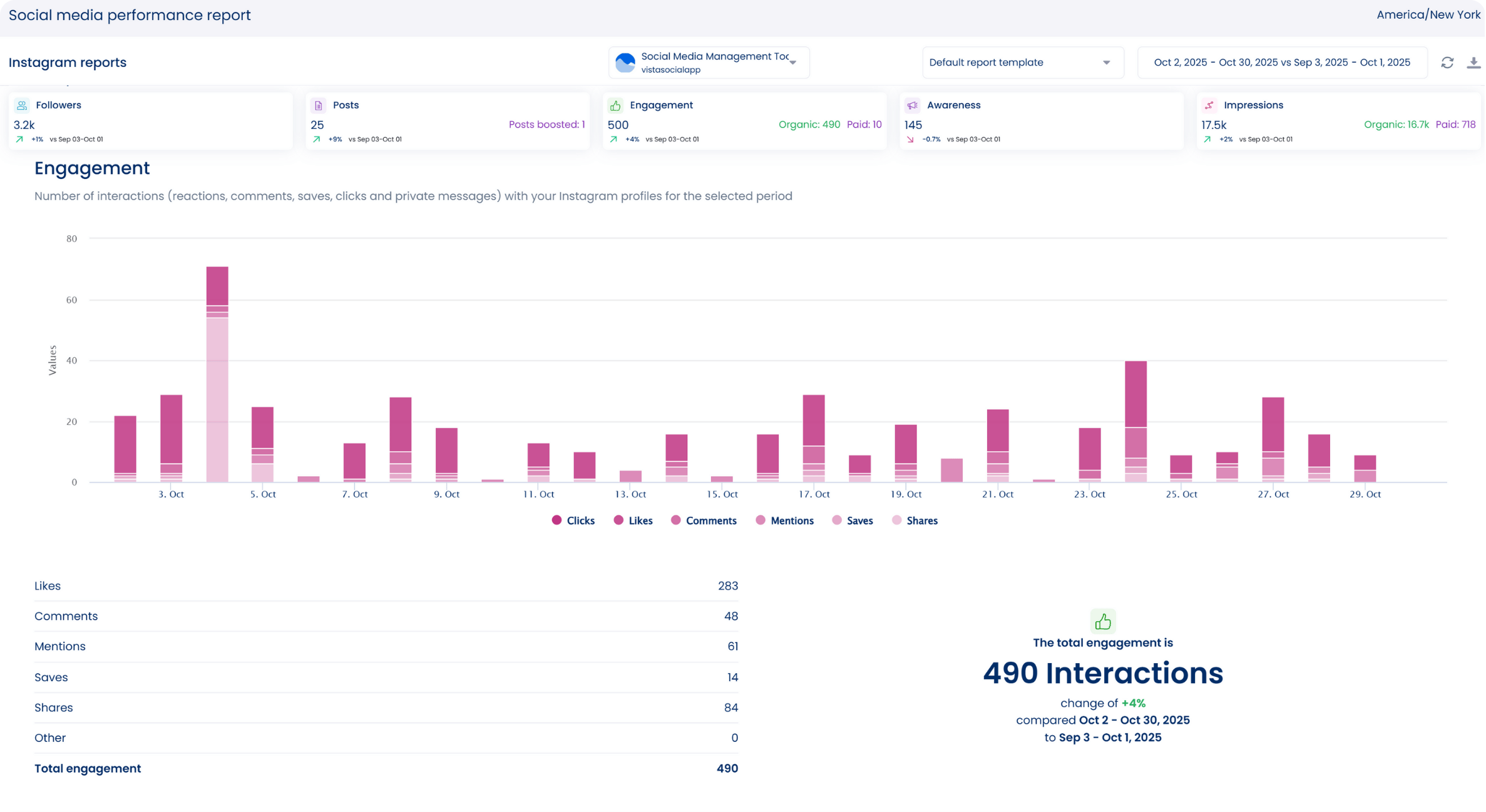 Key metrics like engagement and reach can give you a clearer idea of what content formats resonate most. Use Vista Social’s social media analytics feature to monitor performance and refine your clients’ strategy based on real data.