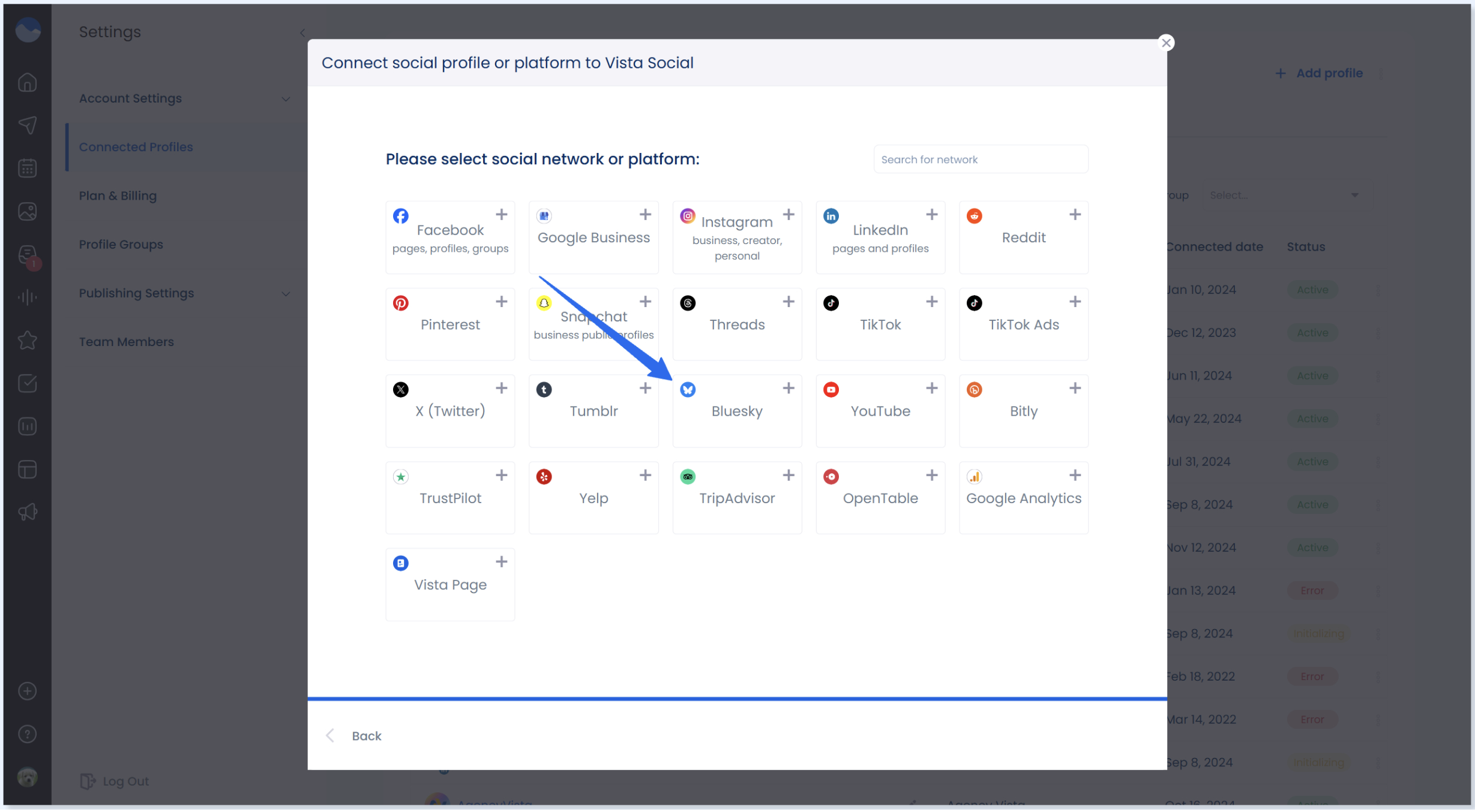 Get Started Now3. Select Bluesky from the list of social networks.