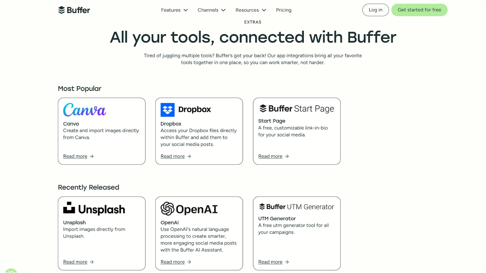 It connects with Canva, Unsplash, Dropbox, Google Drive, OneDrive, Google Photos, Bitly, and WordPress, making it easy to import images, videos, and other files into social media posts. Buffer also supports content curation through platforms like Feedly, Pocket, Quuu, and Scoop.it.