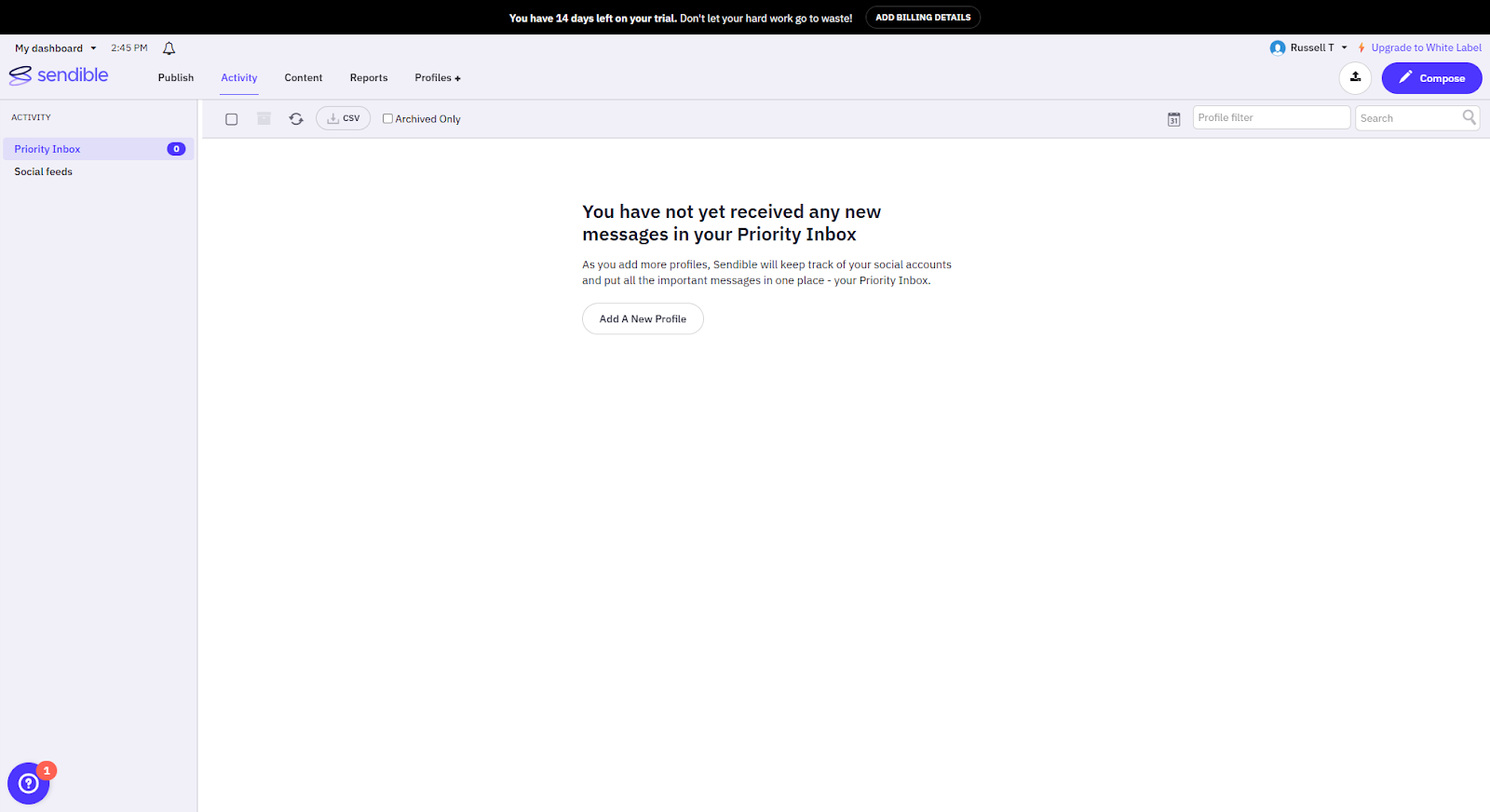 Sendible’s Priority Inbox pulls in messages and comments from platforms like Facebook, Instagram, LinkedIn, and YouTube. You can assign interactions to team members and reply directly. It’s a useful feature, but it doesn’t cover as many sources as Vista Social’s inbox. There’s also no built-in review management.