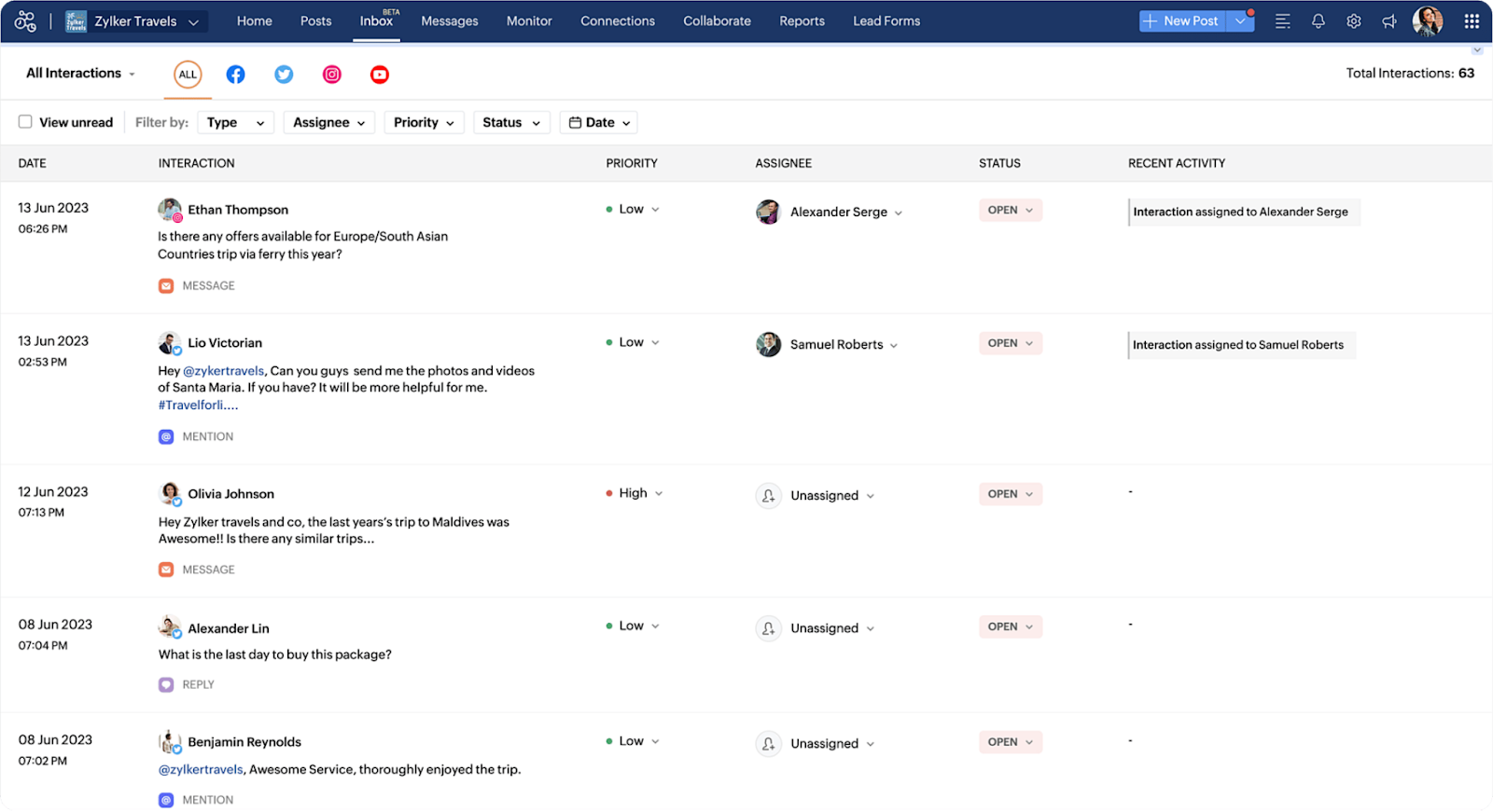 Zoho Social also offers a unified inbox that brings together messages, comments, and mentions from all your social accounts. It emphasizes filters and saved replies to help teams prioritize interactions and respond faster. The platform tracks past customer conversations, giving teams context for more informed responses.