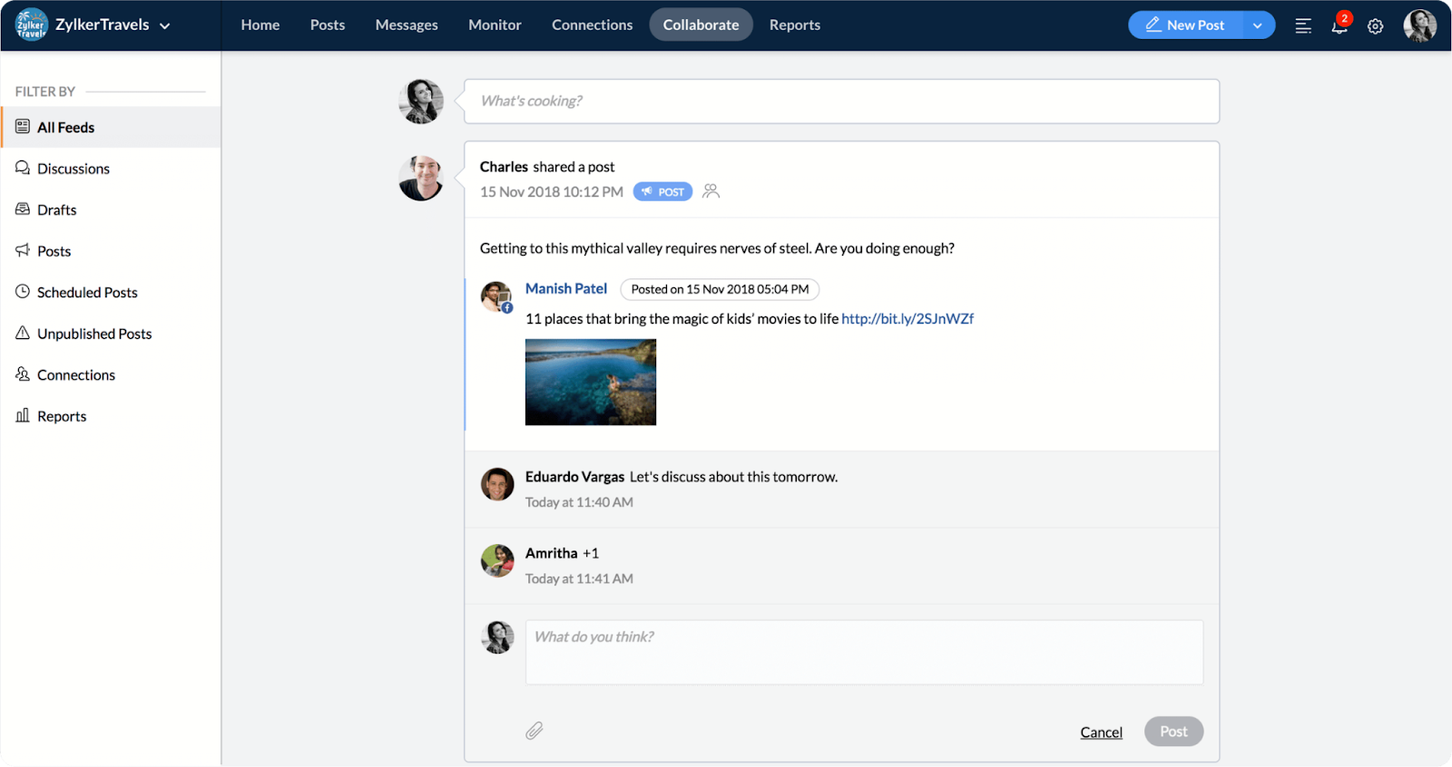 Zoho Social, on the other hand, supports team collaboration with its “Collaborate” tab, where all discussions about posts, mentions, and reports are organized in one place. Teams can use content approval workflows and role-based permissions to keep tasks clear and ensure posts stay on-brand.